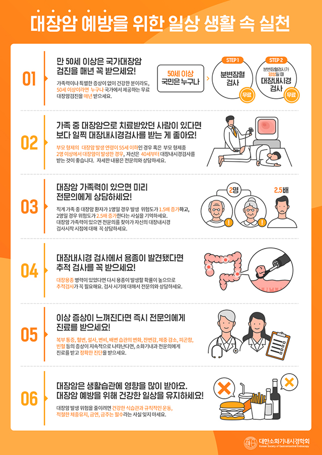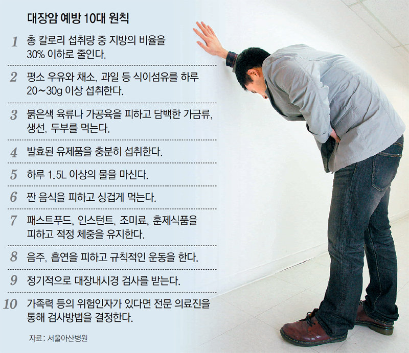 만 35세 이상이고 평상시 육식 위주의 식사를 하는 경우 그렇지 않는 분보다 대장암 발병확률이 높아요. 때문에 가급적으로 육류보다 채소위주의 식습관을 갖는 것이 좋아요. 또 장 운동을 활성화시키고 변을 시원하게 볼 수 있도록 생활습관을 개선시키는 것이 무엇보다 중요할게요