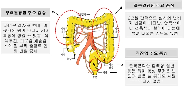 대표적인 대장암 초기증상 변을 보기 힘들다거나 대변을 발생횟수가 줄어들어요. 때문에 배변 습관의 변화가 발생할 경우 대장암 의심해 봐야 해요. 또 변비, 설사 일을 보고 난 후에도 변이 남는 듯한 불편함이 생기거나 검붉은색 선홍색, 끈적한 변을 본다면 이것 또한 의심해 봐야 겠습니다.